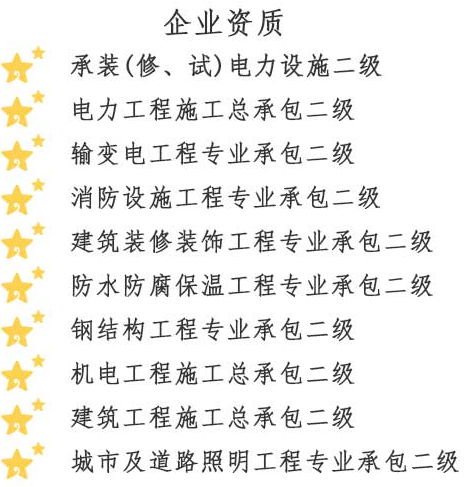 金楓電力集團(tuán)有限公司,成立于2015年5月28日,注冊資金6060萬元,是一家專業(yè)從事電力工程施工的集團(tuán)化公司。公司經(jīng)營范圍包括:電氣安裝服務(wù);建設(shè)工程施工;輸電、供電、受電電力設(shè)施的安裝、維修和試驗(yàn);測繪服務(wù);建筑勞務(wù)分包;建筑工程設(shè)計(jì);發(fā)電機(jī)及發(fā)電機(jī)組制造;建筑工程機(jī)械與設(shè)備租賃;工業(yè)工程設(shè)計(jì)服務(wù);技術(shù)服務(wù)、技術(shù)開發(fā)、技術(shù)咨詢、技術(shù)交流、技術(shù)轉(zhuǎn)讓、技術(shù)推廣等。公司持有國家能源局頒發(fā)的承裝(修、試)電力設(shè)施許可證,承裝類二級(jí)、承修類二級(jí)、承試類二級(jí)資質(zhì);電力工程施工總承包二級(jí)資質(zhì);輸變電工程專業(yè)承包二級(jí)資質(zhì);建筑裝修裝飾工程專業(yè)承包二級(jí)資質(zhì);消防設(shè)施工程專業(yè)承包二級(jí)資質(zhì);防水防腐保溫工程專業(yè)承包二級(jí)資質(zhì);施工勞務(wù)資質(zhì);機(jī)電工程施工總承包二級(jí);建筑工程施工總承包二級(jí);城市及道路照明工程專業(yè)承包二級(jí);鋼結(jié)構(gòu)工程專業(yè)承包二級(jí)資質(zhì);公司已通過質(zhì)量管理體系認(rèn)證、環(huán)境管理體系認(rèn)證及職業(yè)健康安全管理體系認(rèn)證。并獲得省級(jí)信用評(píng)價(jià)AAA證書;連續(xù)多年納稅信用評(píng)價(jià)A級(jí)。